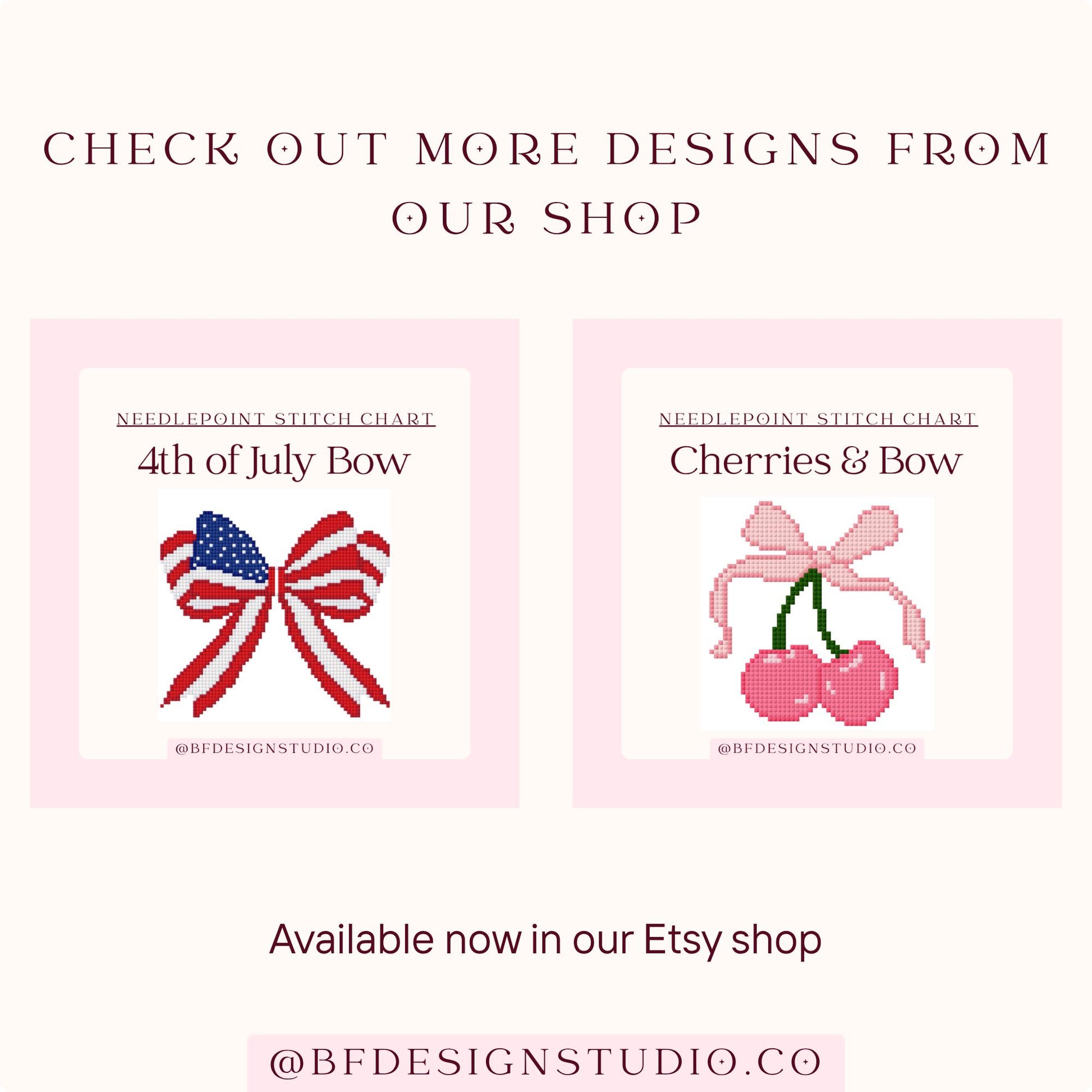 Inspired by our best-selling 4th of July bow, this pink striped bow design is a sweet and versatile addition to your needlepoint collection! Whether you're stitching for a nursery, creating a dainty ornament, or crafting a charming coaster or pillow, this chart is perfect for adding a classic touch with a modern twist. Perfect for grandmillennial stitchers, bow lovers, or anyone who adores soft, feminine accents in their décor.